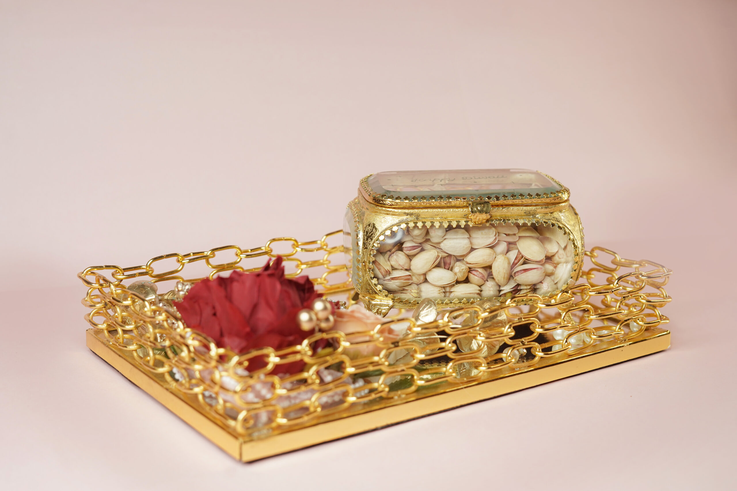 Make every celebration unforgettable with our Golden Luxe Keepsake Hamper. This sophisticated gift set comes in a chic golden basket, featuring a handcrafted glass jar filled with premium pistachios, paired with a jeweled tealight holder that radiates festive charm. Adorned with luxe roses, pearls, and delicate gold accents, the hamper is designed to bring grandeur to every occasion.